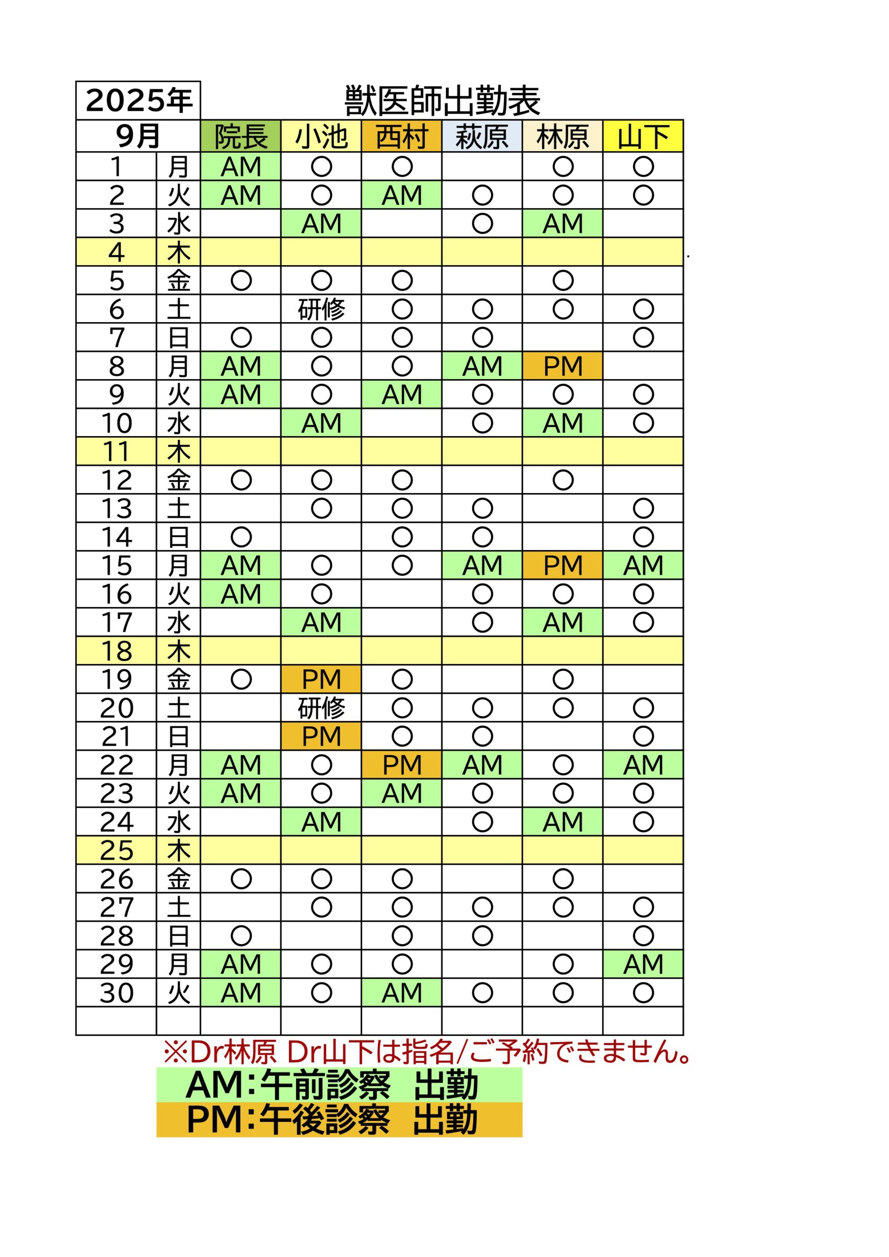 9月 獣医師出勤表