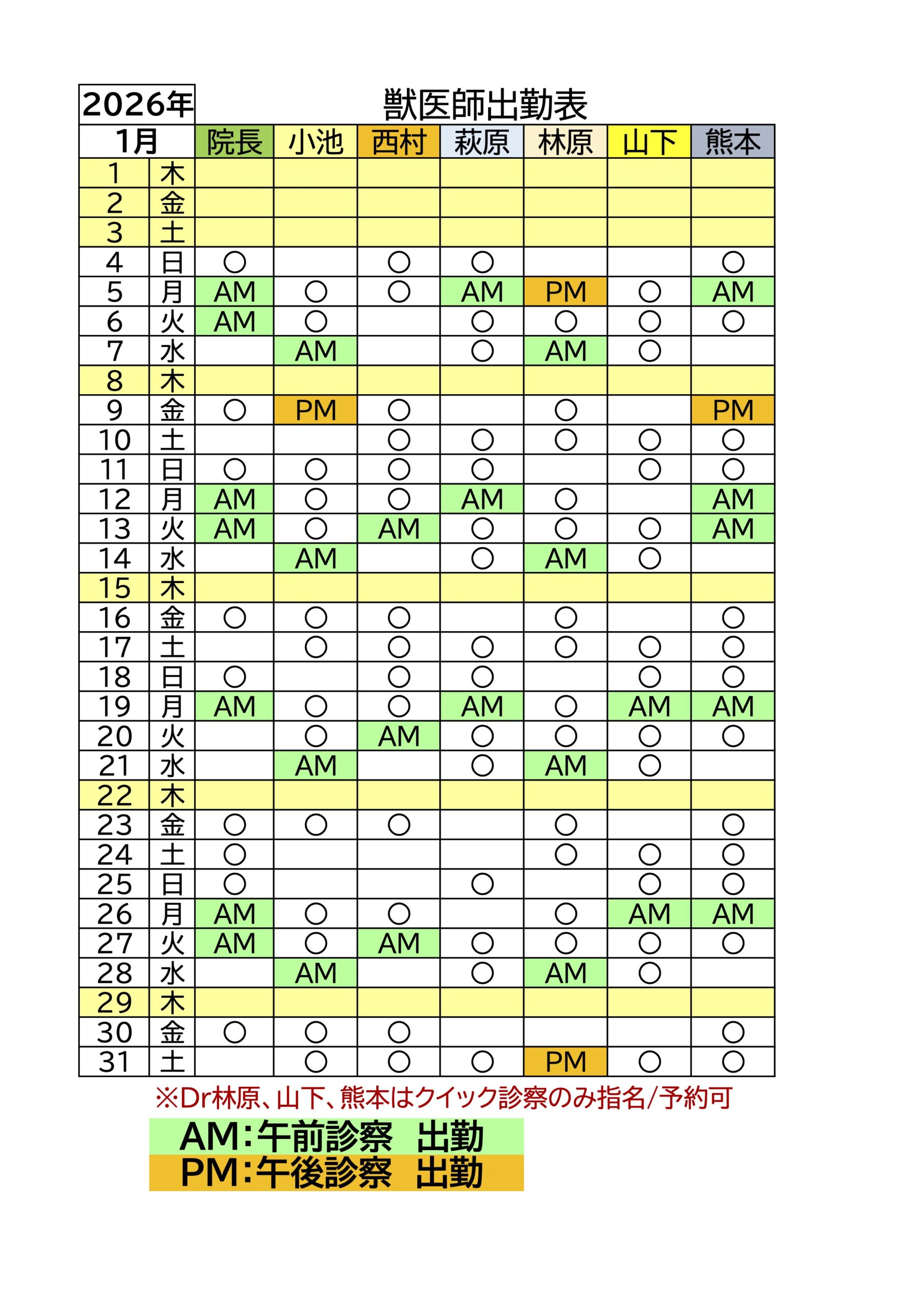1月 獣医師出勤表